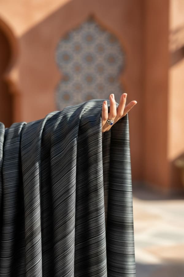 Designed for looking elegant, draped nicely, and feeling soft and light. Barbie crepe abaya fabric is known for its gentle flow and matte finish. It makes an elegant shape that looks good with both modern and classic abaya styles. Crafted from high-quality polyester barbie crepe, This abaya fabric is light but strong, and it breathes well and feels great on the skin. It’s perfect for everyday wear, formal events, and custom designing. It is easy to sew and style, and it looks great with embroidery, pleats, and elaborate motifs.
